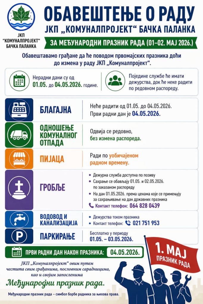 Нерадни дани су од 01.05. закључно са 04.05. међутим, одређене службе ЈКП „Комуналпројект“ -а ће имати дежурне екипе које излазе по позиву, а одређене ће своје радне задатке извршавати по редовном распореду.